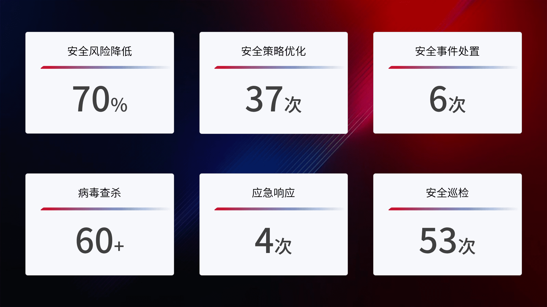 提供全面的安全事件报告体系,,包括处置报告、、周报、、、、季度和年度总结,,,,结合持续监控,,帮助客户深入了解网络安全状况。。